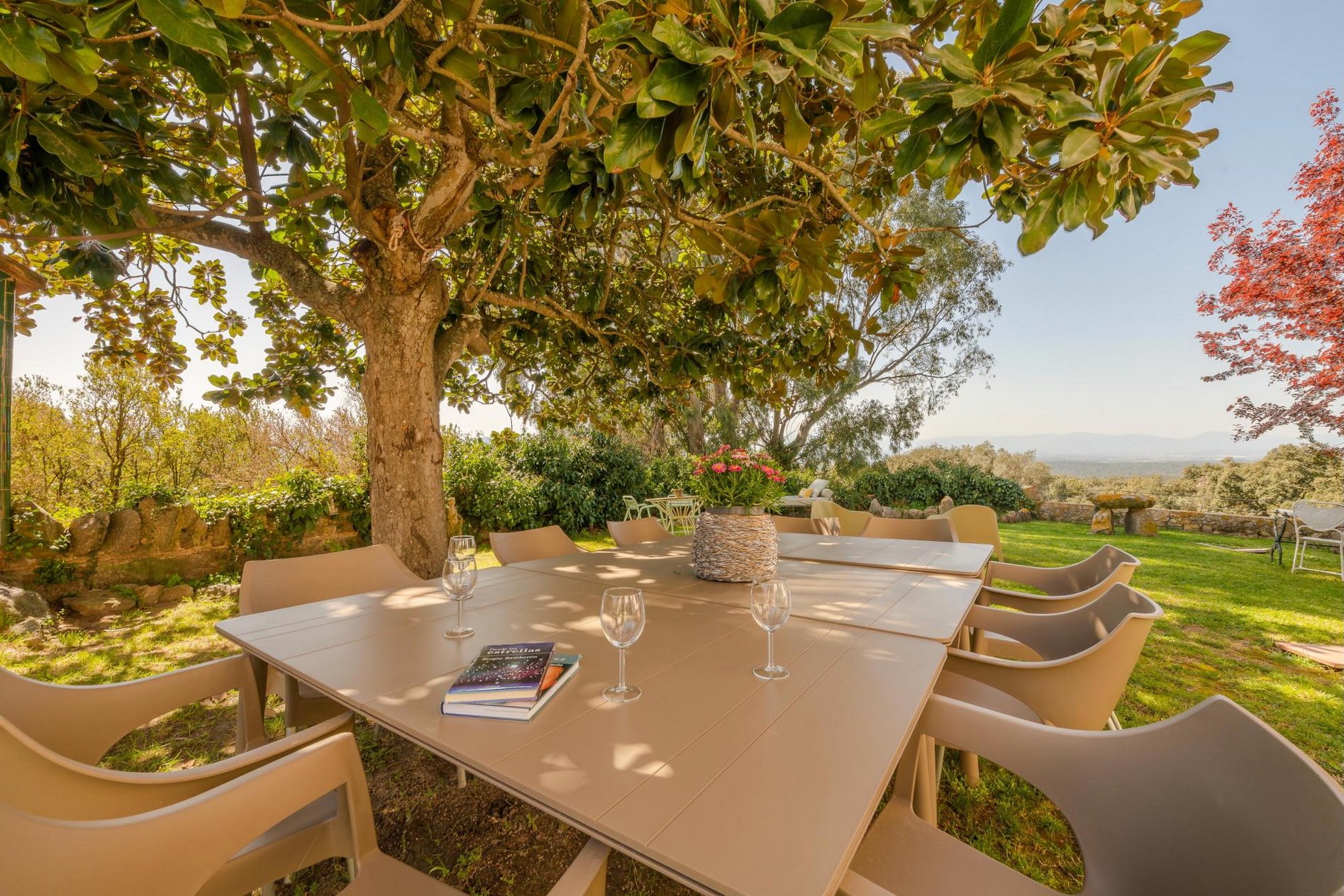 Casa Almeda has a beautiful garden with sweeping views over the forested valley to the Garrotxa mountains and the Pyrenees in the far distance. There are plenty of spots to sit and enjoy the peace and birdsong. The sunsets are spectacular.